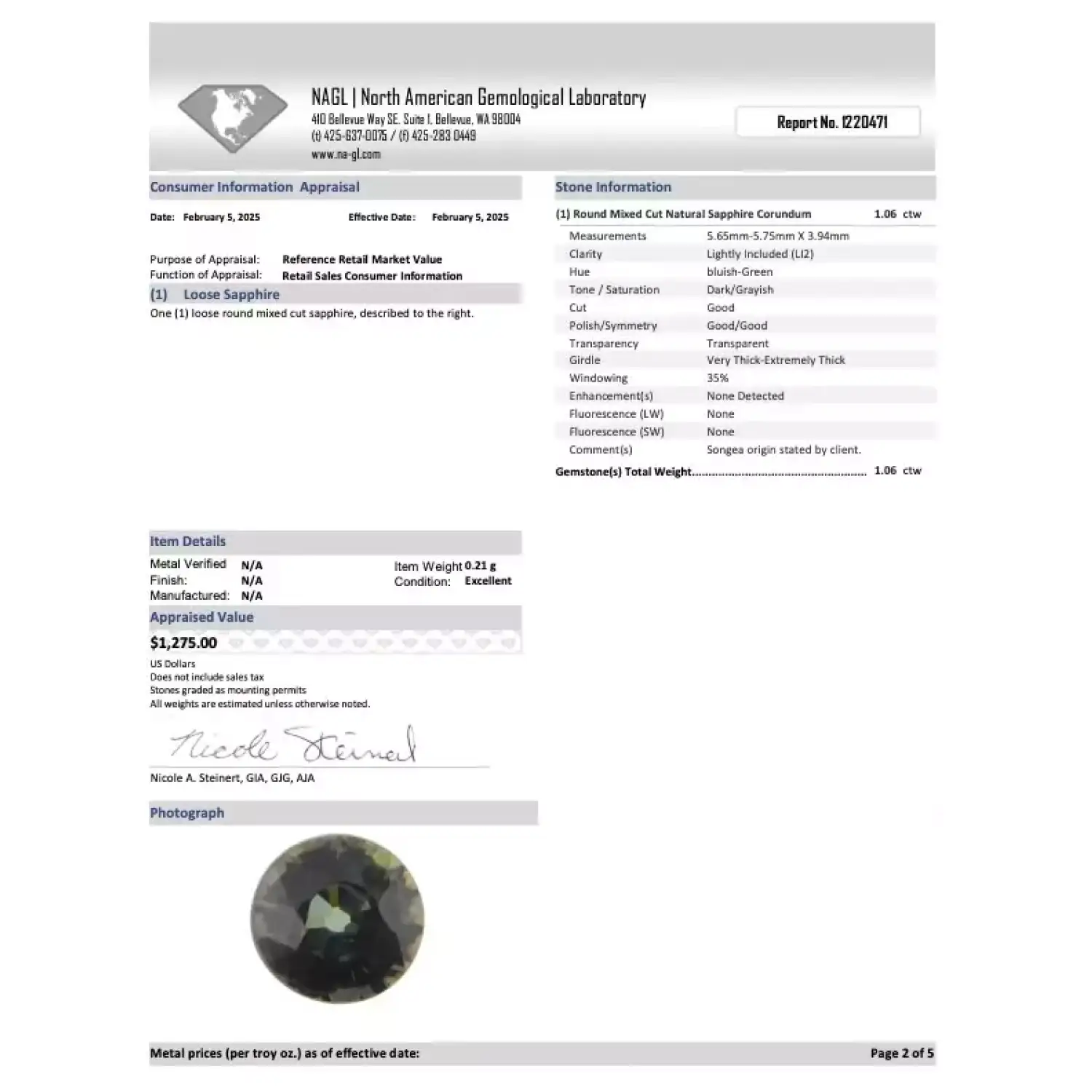 Discover the captivating beauty of the 1.06ct NAGL Certified Round Unheated Bluish Green Songea Sapphire Gemstone, SI2. This exceptional gemstone is a true marvel of nature, showcasing a stunning bluish-green hue that captivates the eye.