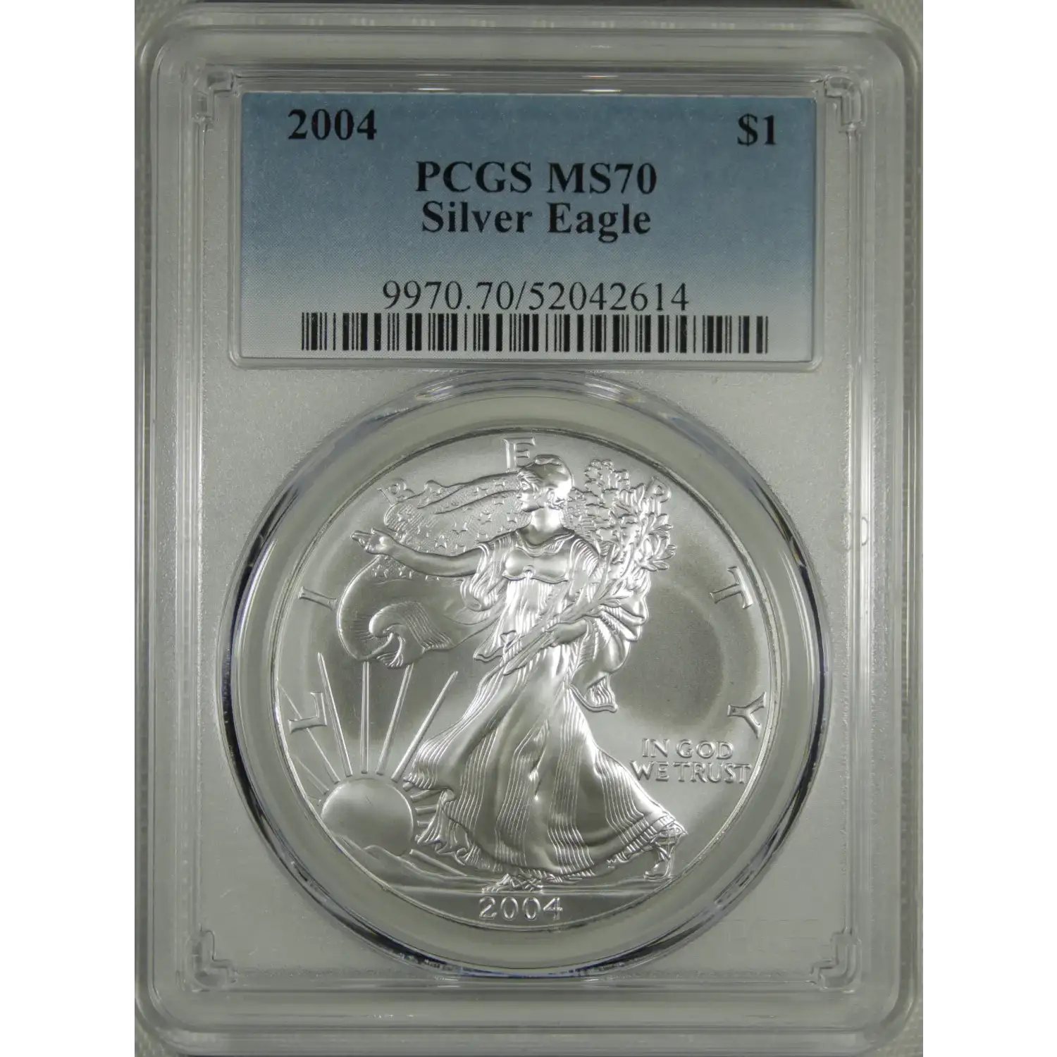 The 2004 American Silver Eagle was struck as part of the U.S. Mint’s ongoing bullion program introduced in 1986. These coins were produced for investment purposes and carry the Walking Liberty design on the obverse and the heraldic eagle reverse used through 2021.